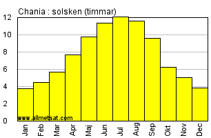| Månadsgenomsnitt av antalet soltimmar per dag. |